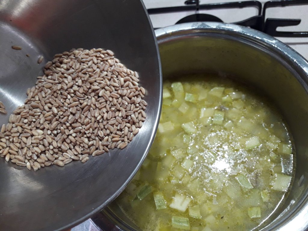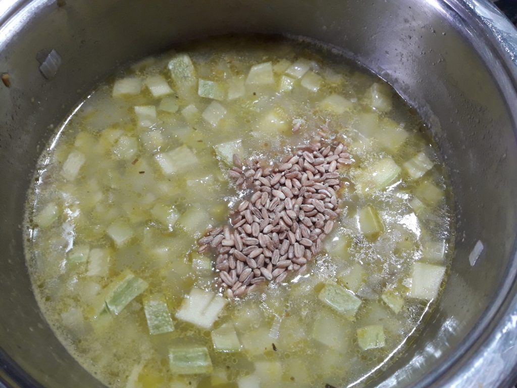 When the zucchini is boiling again, pour in the spelt, stir and let it cook for about 15 minutes.