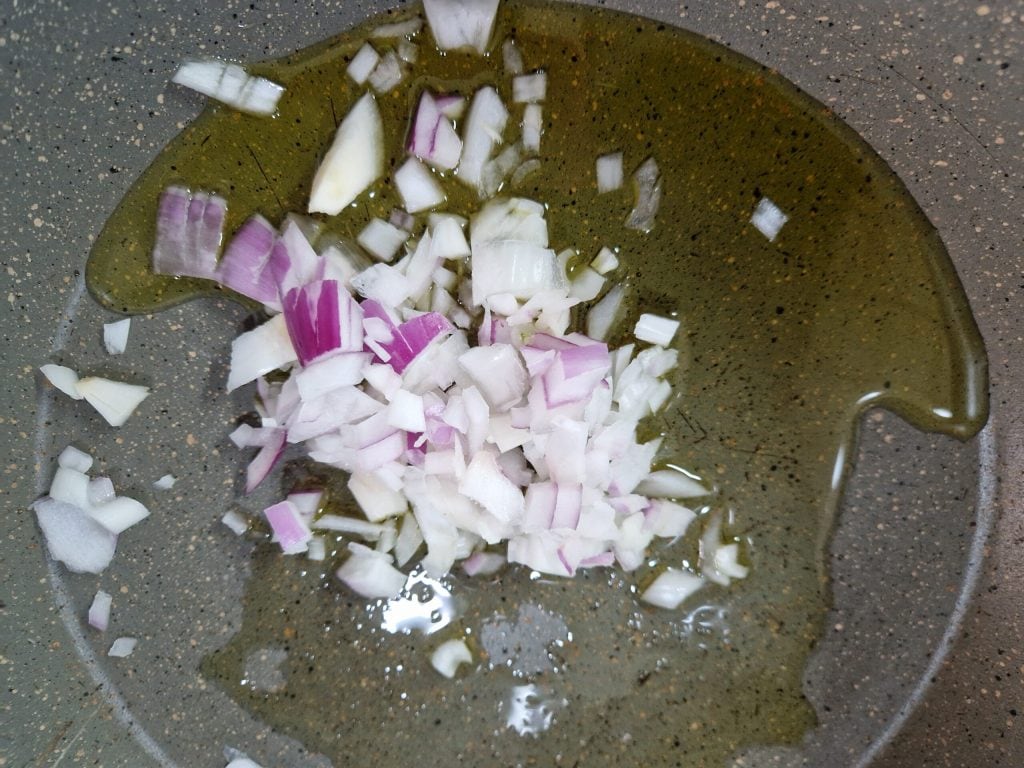 Peel the onion, cut it into pieces, and put it in the pan with oil; sauté for about 3 minutes
