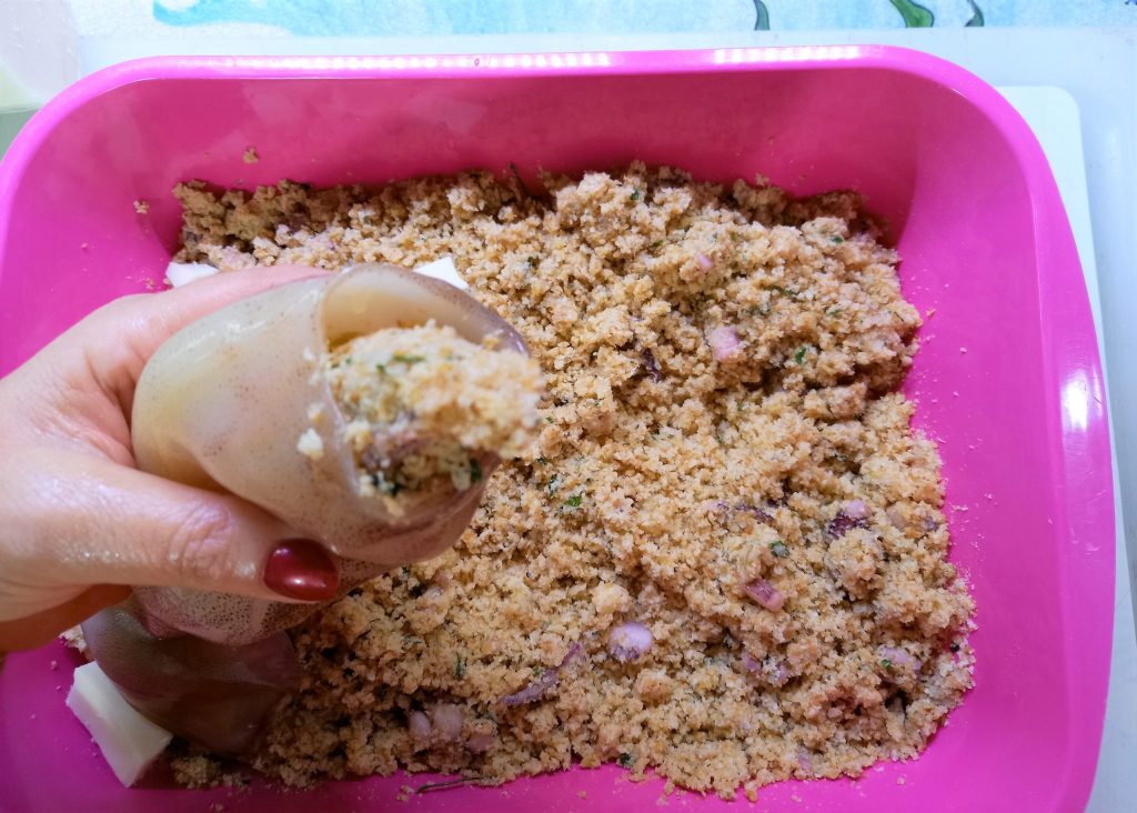 Fill the squid or calamari pockets, placing a slice of provola between each mound