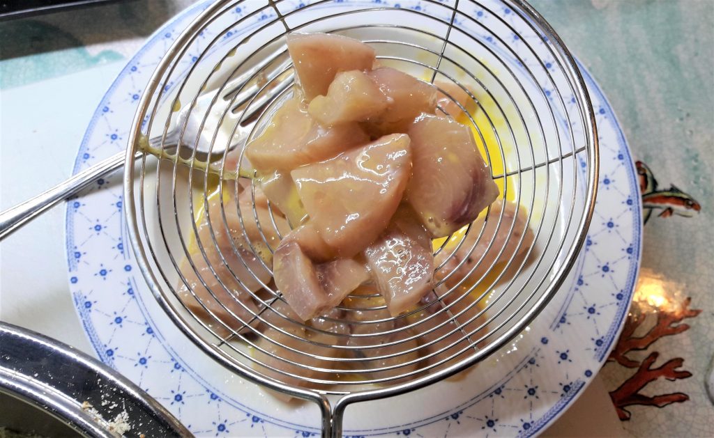 and dip the swordfish pieces in it, then drain them with a skimmer before…