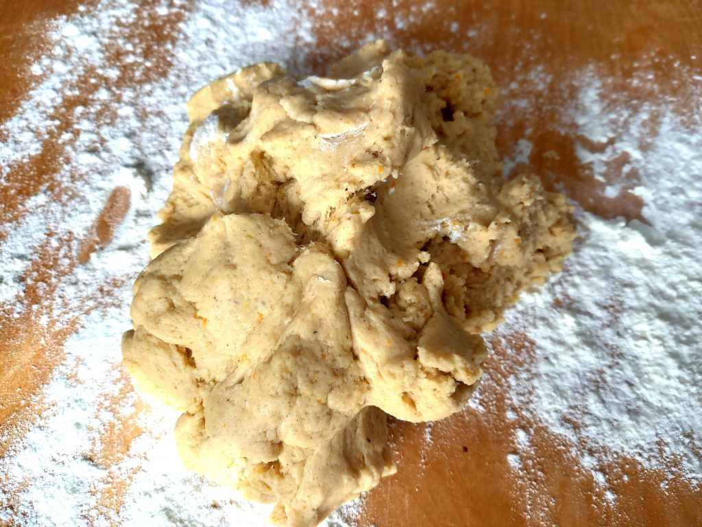 Sift the flour and place it on a work surface with the sugar, lard cut into pieces, honey, aromas, spoon of orange zest, pepper, and baking soda, and knead
