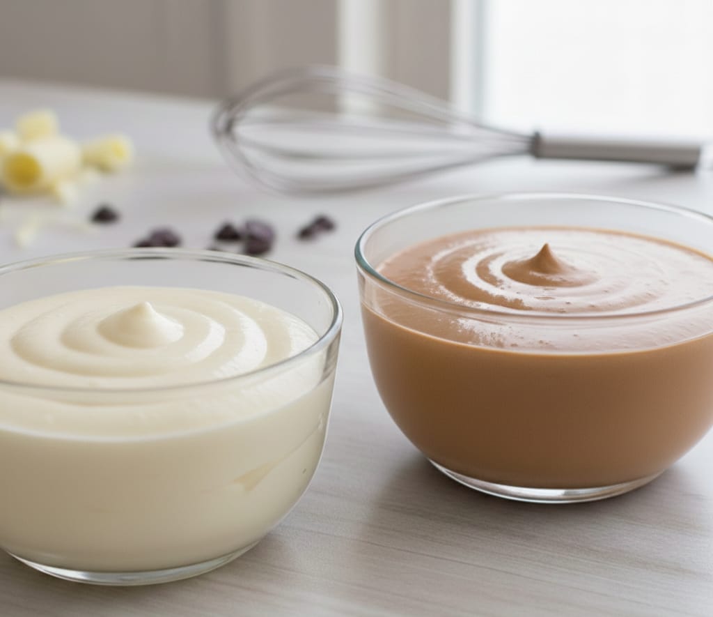 Pour the hot milk and gelatin mixture over the chopped white chocolate, stir until it melts and becomes smooth and velvety. Let the mixture cool until it reaches a temperature of 97°F (36°C).
