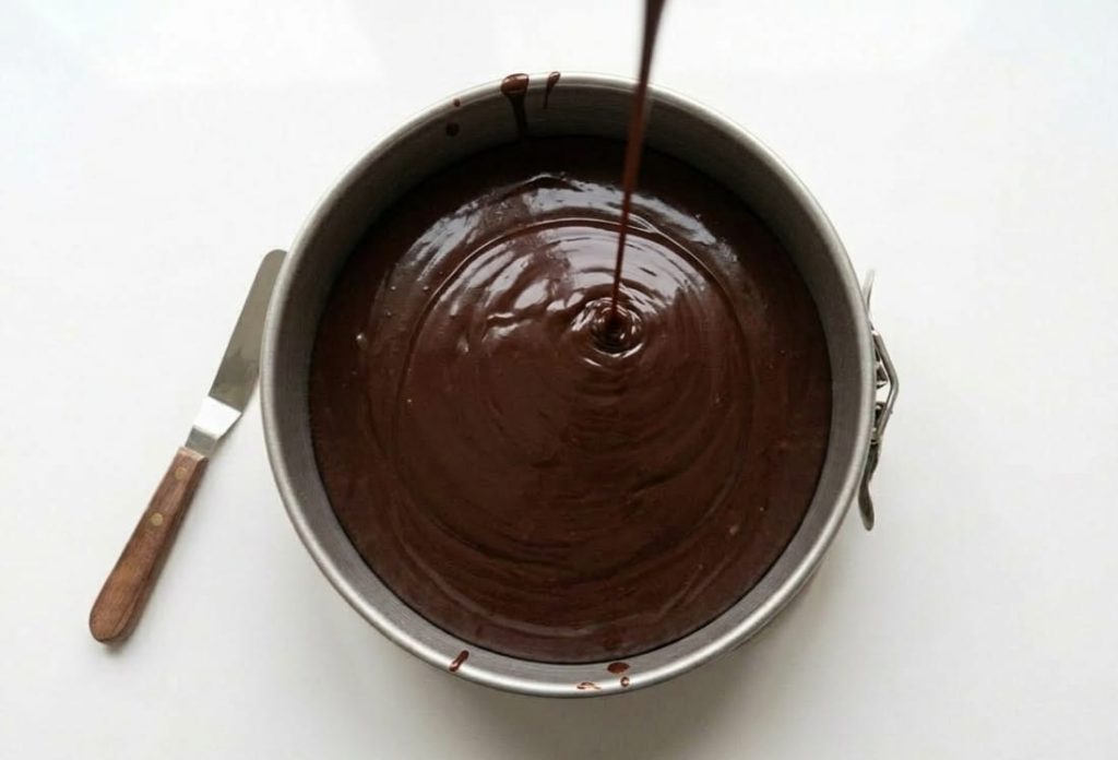 Pour the freshly made mousse into the pan on top of the cocoa base, level carefully and evenly. Refrigerate the mousse for at least one hour, or until well set and firm, then proceed with the second layer.