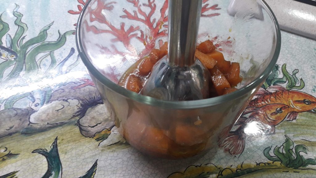 When the pumpkin has softened, put it in a glass bowl and with the immersion blender…