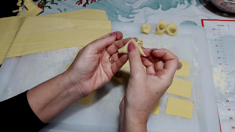 • I placed my pinky in the middle, and wrapped the tortellino around it, making the ends meet.