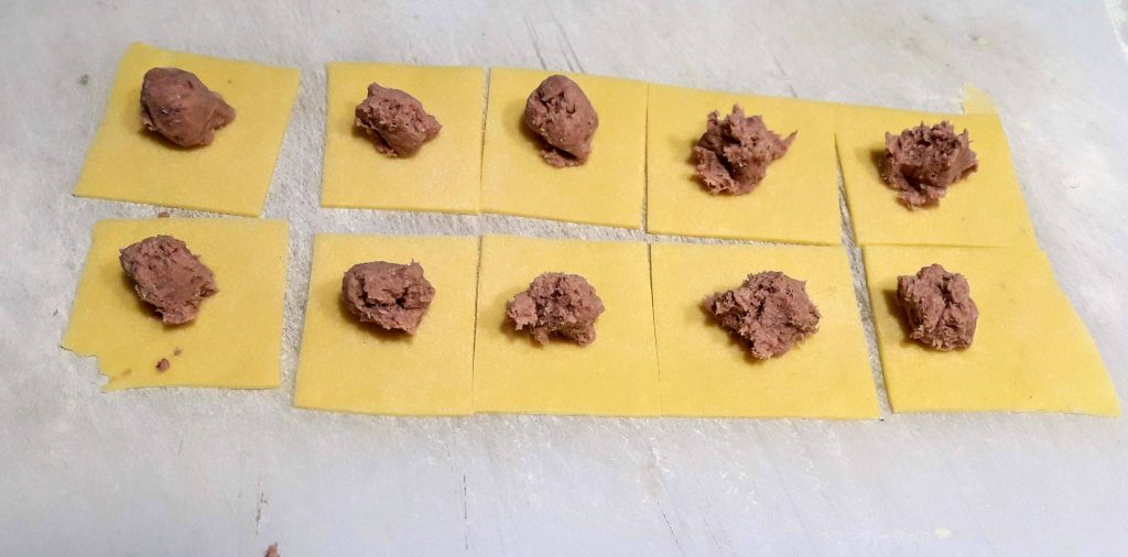 • Then I cut squares of about 3/4 inch per side and placed a little filling on top.