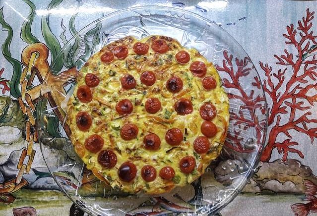 Transfer the mixture to a round baking pan lined with parchment paper. Decorate with the cherry tomatoes.