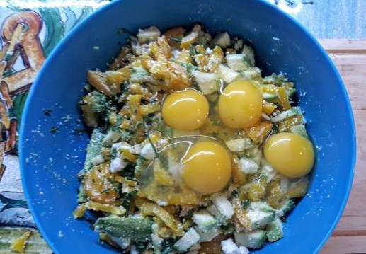 Preheat the oven to 350°F. In a bowl, combine the bell peppers, zucchini, grated pecorino romano, and the chopped herbs.
