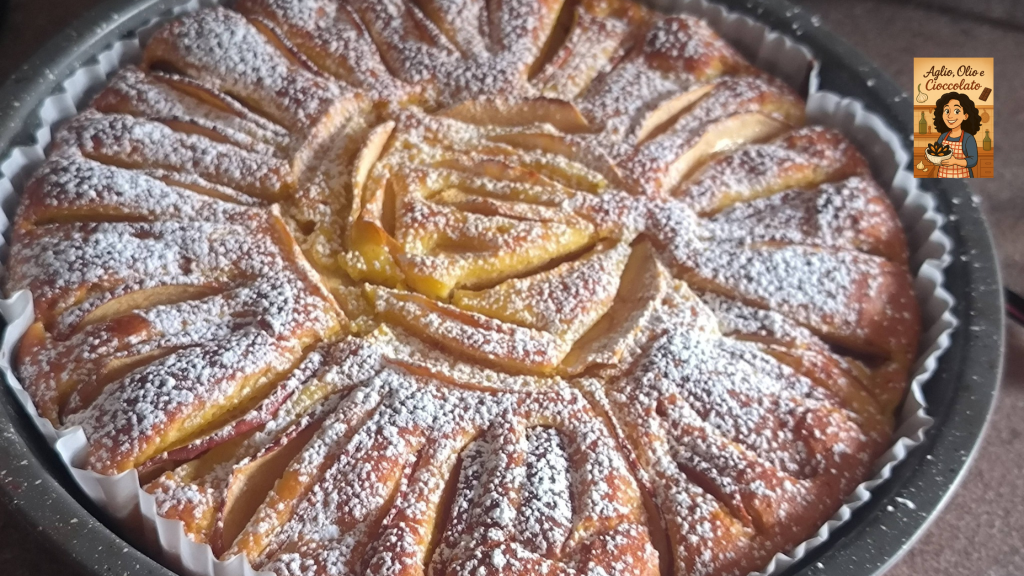 Peel another apple, cut it into pieces, and add it to the batter, stirring gently. Pour everything into the pan lined with parchment paper and now decorate with the other two apples. Slice them thinly and arrange them in a radial pattern on the cake.