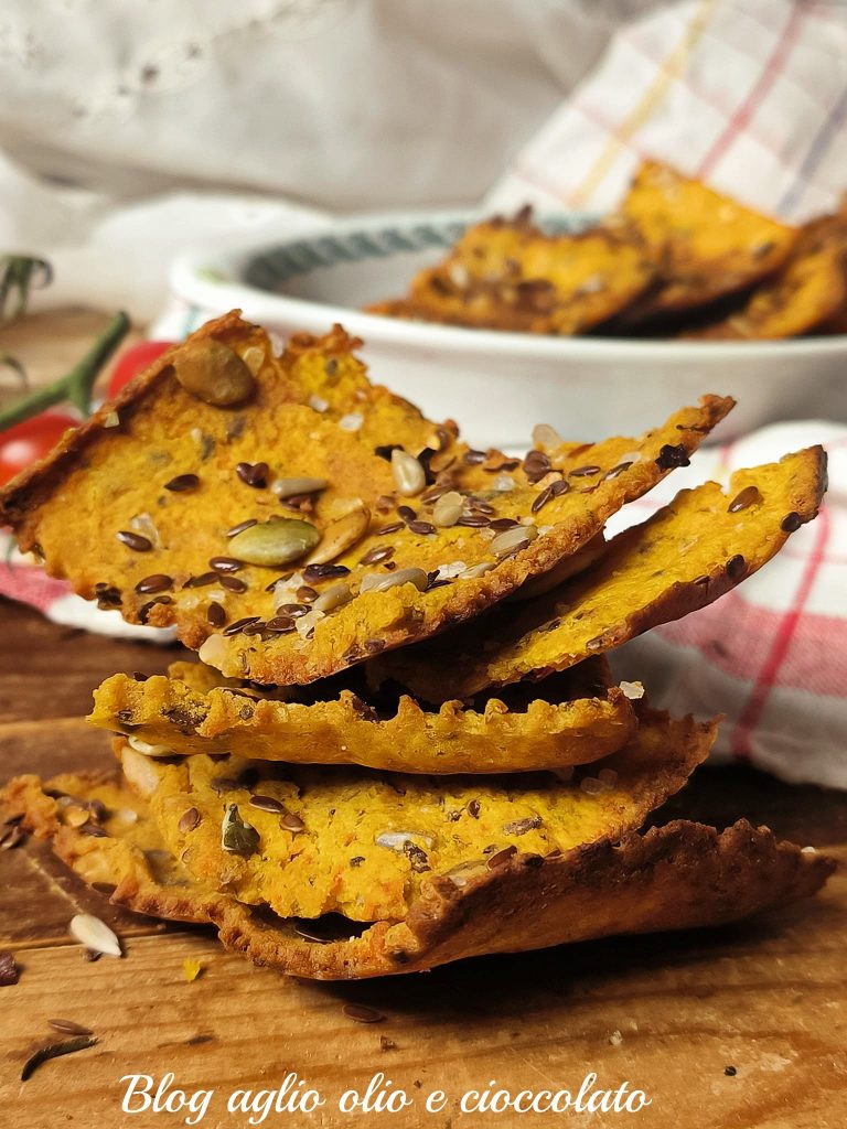 Blend the carrots with the onion, then gradually add the flour and water. Finally, adjust the salt and add the spices you like best, plus a generous handful of seeds. Mix everything well and transfer the mixture onto a sheet of baking paper, cover it with another sheet of baking paper, and with the help of a rolling pin, press it well; it should be quite thin, otherwise, they won’t be crispy. Brush well with oil and sprinkle again with seeds; I also added a bit of pepper. Using a pizza cutter, cut the dough into strips and then into rectangles. Bake everything at 356°F for about 20 minutes at most, but adjust according to your oven, or cook in an air fryer at 392°F for 15 minutes. Remove them from the oven and let them cool