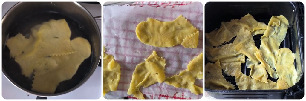 Roll out the dough pieces with a rolling pin, they need to be very thin. Heat water in a saucepan and when it starts boiling, dip the sheets into it, and when they float to the top, drain them onto parchment paper and then place them in the fryer basket.