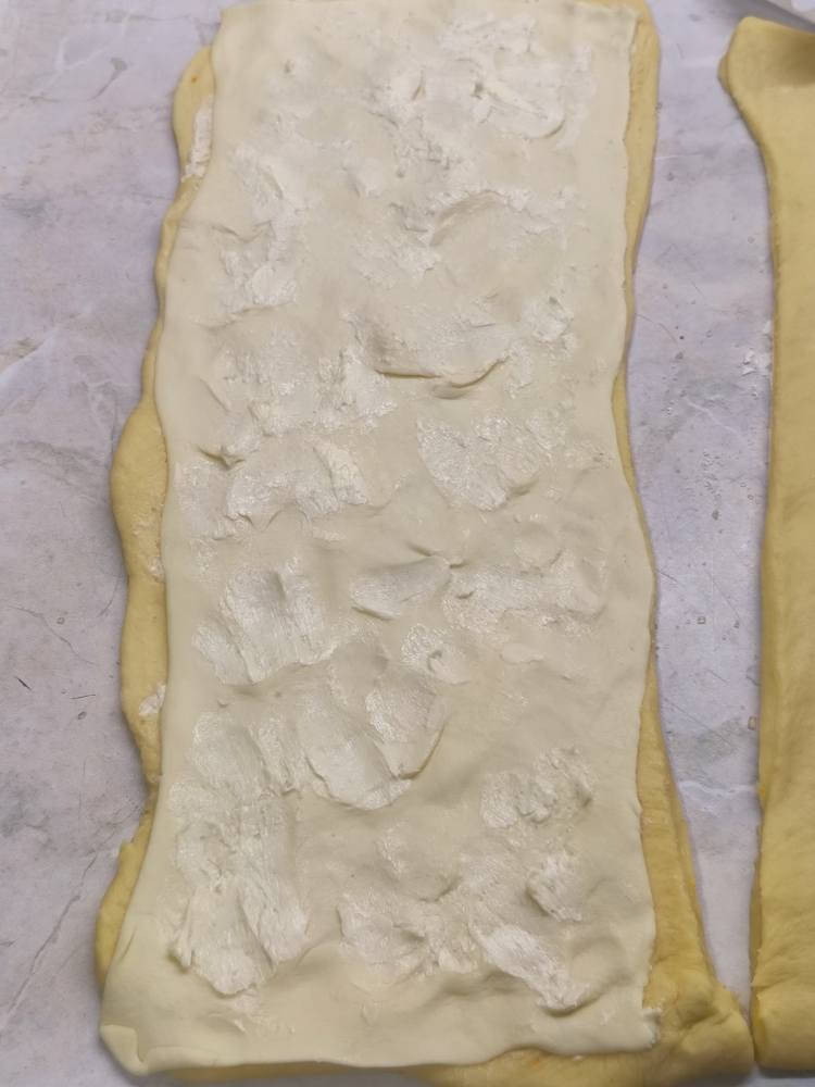 After rising, roll out the dough and form a large rectangle not too thin and divide it in half widthwise to obtain two rectangles. Mix soft butter with sugar and spread it on each rectangle of brioche dough and add a handful of chocolate chips. Also, divide the puff pastry in half and place half of the puff pastry on half of the brioche dough, as you see in the photo.