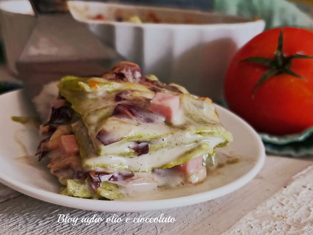 Start assembling the lasagna. In a bowl, combine the cooked ham, chopped radicchio, almost all of the gorgonzola, a sprinkle of parmesan, and finally, almost all of the béchamel sauce, leaving a little aside. Cover the bottom of a baking dish with béchamel sauce, I used an oval dish for 4 people, add the well-dried green sheet, and cover with some filling, continue like this until you finish the sheets. Finally, on the last layer, sprinkle with some parmesan and a bit of well-drained mozzarella, a few dollops of gorgonzola, and into the air fryer for 20 minutes at 392°F (200°C). The green lasagna is ready to be enjoyed.