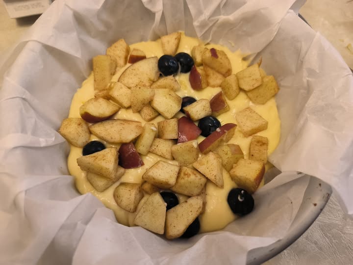 • NOW LET’S ASSEMBLE AND BAKE THE CAKE: Pour half of the batter into a 9.5-inch round pan lined with parchment paper. Add some of the apples and blueberries on top, a sprinkle of cinnamon, cover everything with the rest of the batter, and add all the remaining fruit with a generous sprinkle of sliced or chopped almonds. Bake at 356°F for about 35 minutes, but adjust according to your oven and do the toothpick test. Remove from oven and dust with powdered sugar.