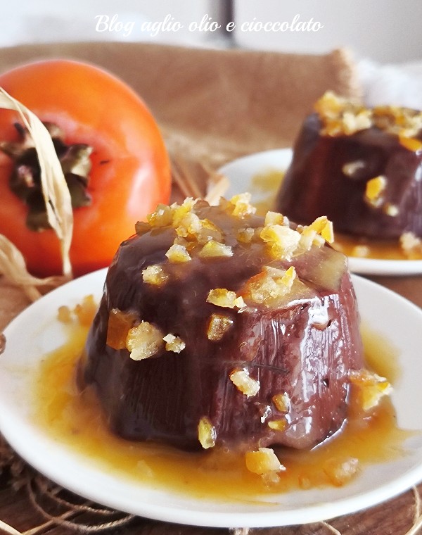 The persimmon and chocolate pudding with orange flavor is a creamy dessert that is very easy to prepare. An egg-free recipe, naturally sweet thanks to ripe persimmons. The contrast between dark chocolate and the fresh aroma of orange makes this pudding an irresistible spoon dessert.