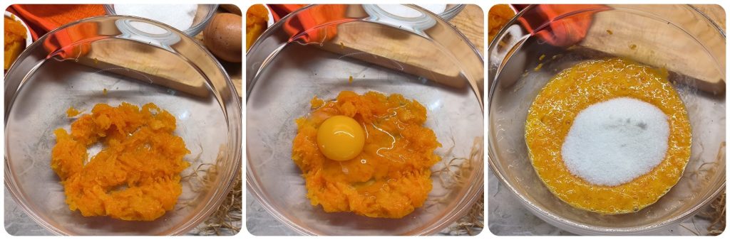 Pour the pumpkin pulp into a bowl, add the egg, then the sugar, and mix everything.