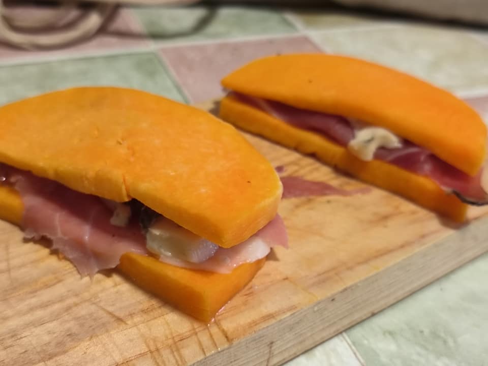 Butternut squash cutlets, a super tasty recipe stuffed with scamorza cheese and speck and cooked in an air fryer, so they’re fried but not entirely fried. These delights are also known as Pumpkin Sandwich or Pumpkin Cordon Bleu; in short, they are slices of squash halved and stuffed with a delicious and stringy filling like the fried eggplants stuffed with mozzarella and cooked ham. I cooked the squash in an air fryer, but you can easily fry them in a pan or bake them in the oven. Try them because they are a real treat. Let’s see what we need to make the stuffed butternut squash cutlets in an air fryer.