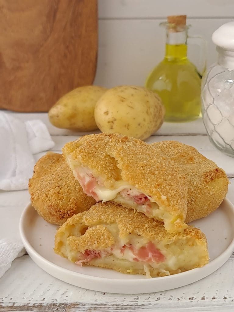 Stuffed potato patties can also be prepared in advance and kept in the fridge before cooking. For cooking, you can opt for the lighter method, either in the oven or air fryer, or fry them in a pan using peanut oil. For the filling, you can choose other cold cuts, cheeses, or vegetables of your choice. With this recipe, I made 4 patties, but it often depends on the size you give them.