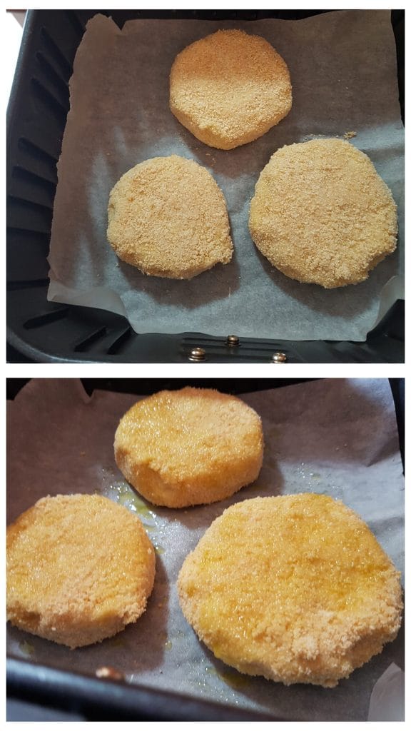 In this case, I chose to cook them in an air fryer, so preheat the air fryer to maximum power for a few minutes. Then place a sheet of parchment paper in the fryer basket and the patties, spray the surface with extra virgin olive oil, and cook at 375°F for about 15-20 minutes or until golden brown. Turn the patties halfway through cooking to cook both sides. If you want to bake the patties, just bake them at 350°F for 30 minutes.