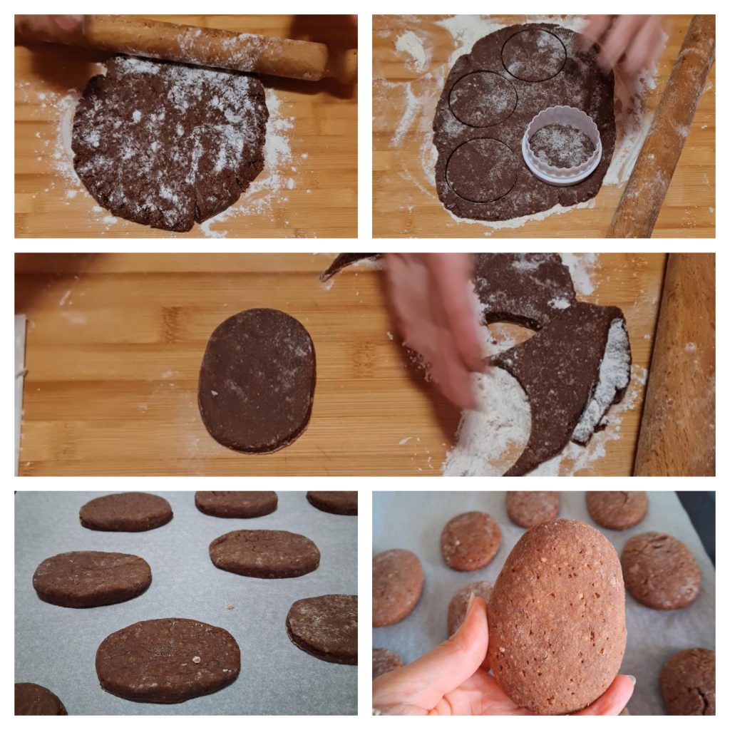 • At this point, on a work surface sprinkled with a little flour, roll out the dough with the help of a rolling pin until you get a thickness of about 3/8 inch. Using an oval pastry cutter or, as I did, using a simple round pastry cutter of 3 inches, cut out the cookies. With your hands, shape them into an oval shape. Gently place all the cookies on a baking sheet lined with parchment paper. The dough will be soft, so be careful, using a spatula to lift them. Bake in a static hot oven on the middle shelf at 350°F for about 15 minutes and as soon as you see the cracks on the surface of the cookies, it’s time to take them out and let them cool completely without touching them.