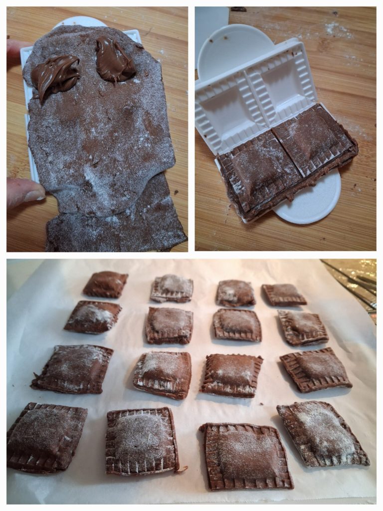 Take the dough out of the fridge and flour the work surface well. Then use a pasta machine and start rolling the dough from number 3 to number 6 thickness. It should be thin. For convenience and to make them all perfectly aesthetically, I used a ravioli mold, but you can make them the traditional way by placing the sheet on the work surface and then placing mounds of Nutella spaced apart (you can use a piping bag or teaspoon), brushing the sheet with water, and covering with another sheet and using a scalloped wheel or cutter to create small ravioli. Instead, I simply placed the sheet in the mold, added the Nutella, closed it, and easily obtained ravioli of the same size.