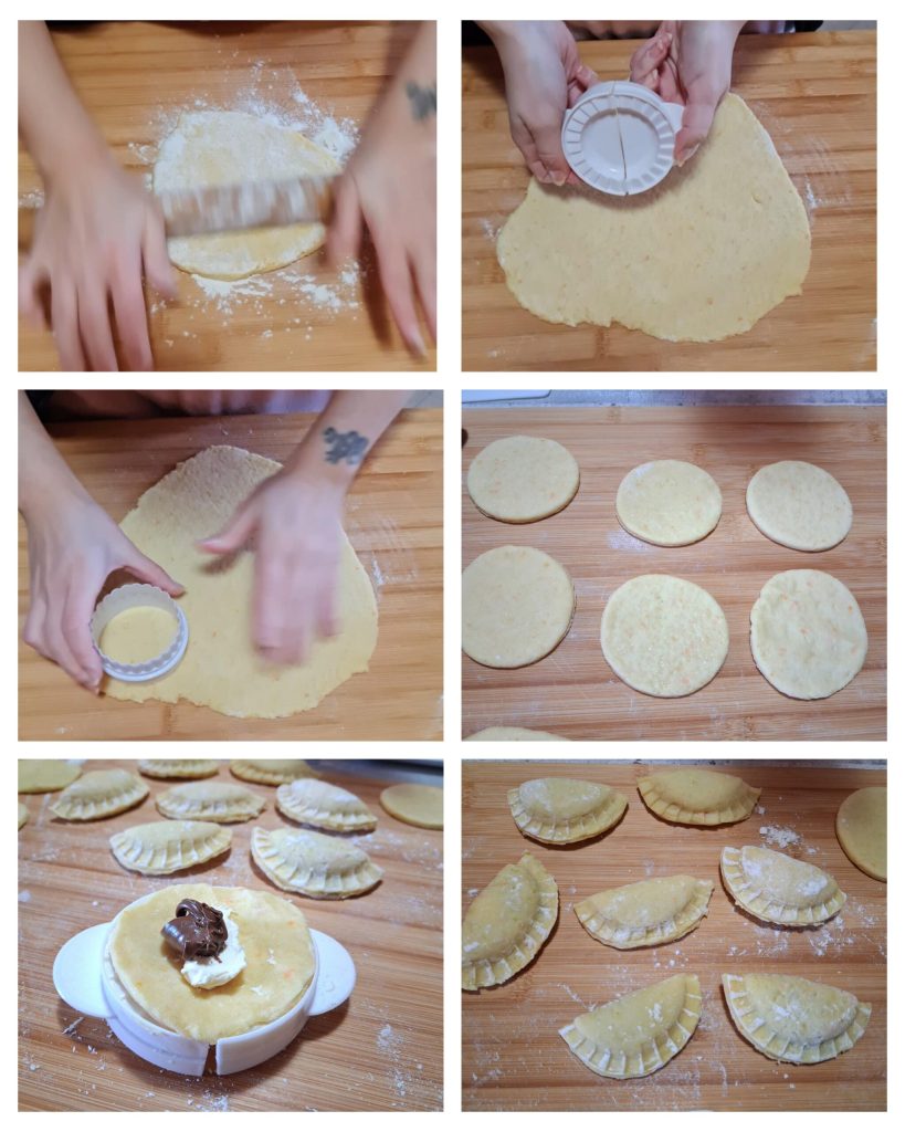 On a floured work surface, use a rolling pin to roll out a sheet 1/8 inch thick and cut out discs with a round cutter. Place these shortcrust pastry discs on the tool to make ravioli and fill the center with a tablespoon of Nutella and a teaspoon of mascarpone, close and seal well. If you don’t have this tool, you can easily do everything by hand as my grandmother used to do, cutting out a disc of dough with a glass and placing the filling in the center, folding it into a half-moon and sealing the edges well with the back of a fork.