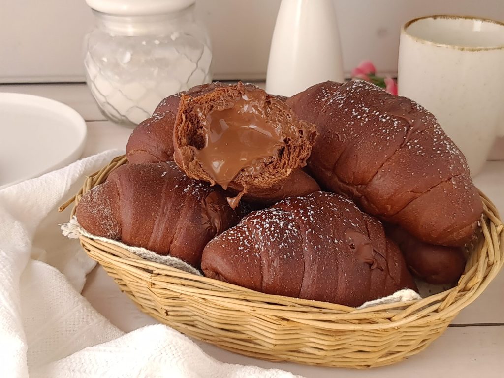 Chocolate brioche croissants filled with Nutella can be frozen or left to rise in the fridge overnight. They can be stored in airtight containers or food bags for a couple of days. If desired, you can heat them in the microwave for a few seconds before enjoying them, so they will be like freshly baked. You can choose the filling, and if you want, you can fill the croissants before, at the moment you form them.
