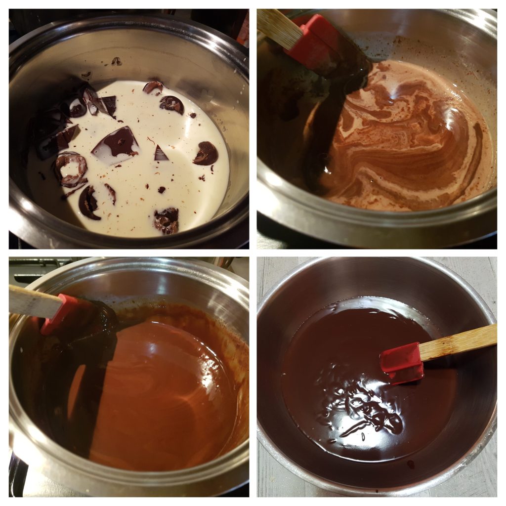 • In a saucepan, heat the cream, turn off the heat and add the chopped dark chocolate, and mix until you obtain a shiny and creamy glaze. Let cool for 2 hours in the fridge. When the cream has become solid, place it in a piping bag equipped with a striped nozzle.