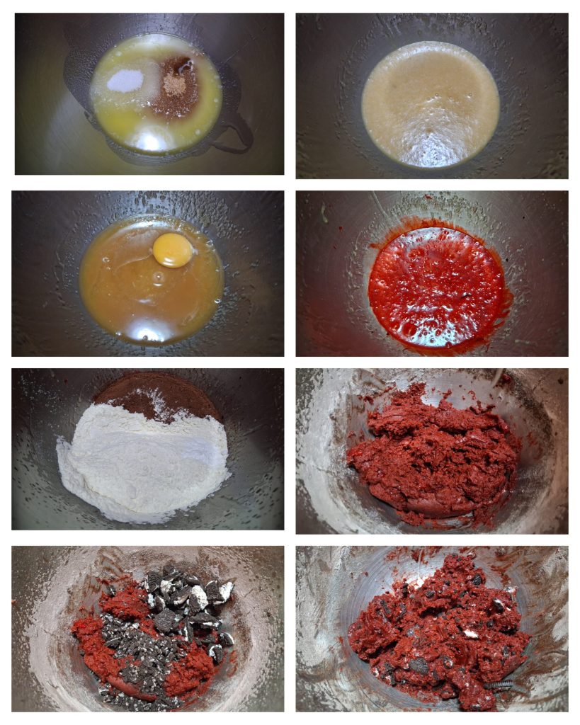 In the bowl of the stand mixer, mix using the paddle attachment (K) for a few minutes at medium speed the egg with both sugars and vanilla extract. Melt the butter separately in a bowl in the microwave or in a bain-marie and add it once cooled to the egg mixture and mix. Add the red food coloring and mix thoroughly. Finally, add the sifted flour with cocoa powder, baking soda, and salt and mix again at speed 2 for a few minutes. Finally, add half the crushed Oreo cookies with a knife and the other half in large pieces and continue mixing with a spatula for a few seconds.
