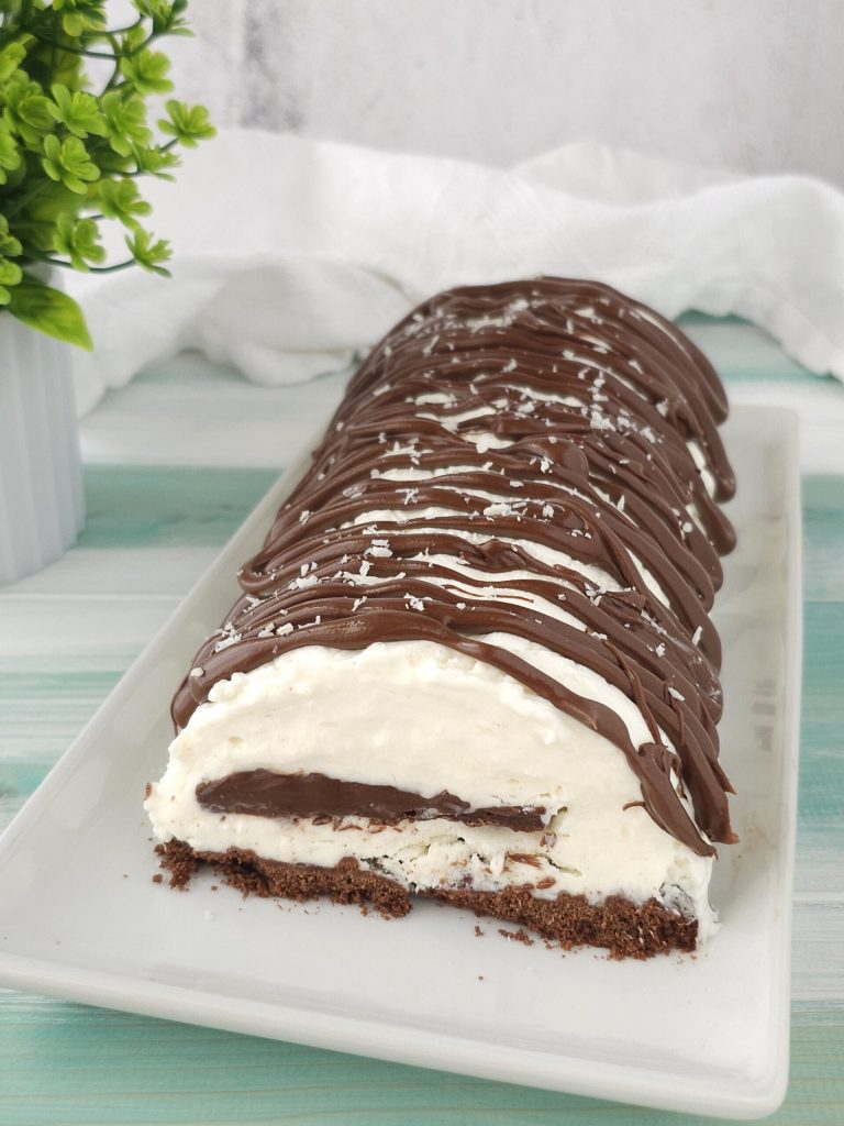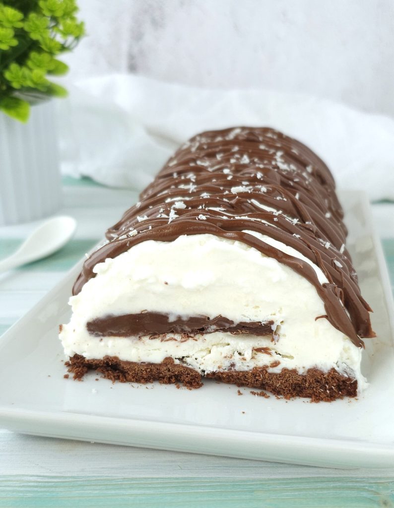 After the resting time, take the dessert out of the freezer, gently remove it from the pan and take off the plastic wrap. Place the ice cream block on a serving plate and decorate the surface with more Nutella and a sprinkle of grated coconut. It’s ready to be served. I hope you like this latest recipe of mine, see you next time friends.