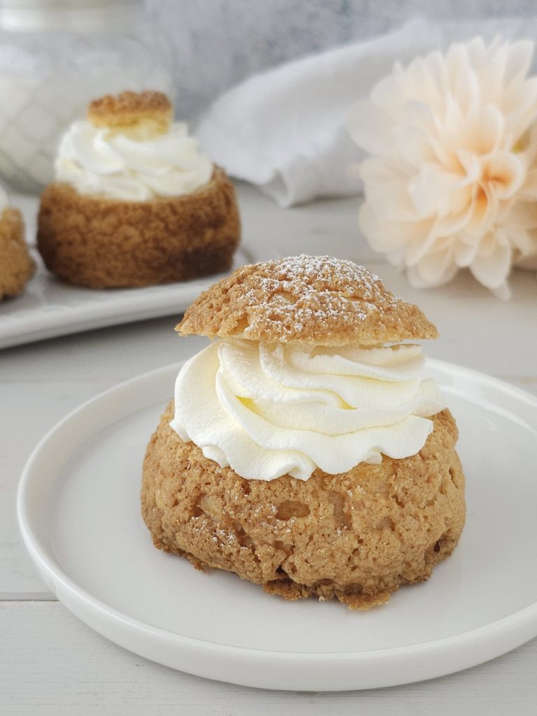 • Place the craquelin choux with whipped cream on a tray and dust the surface with some vanilla powdered sugar and serve them. I hope you like my latest recipe, see you next time friends.
