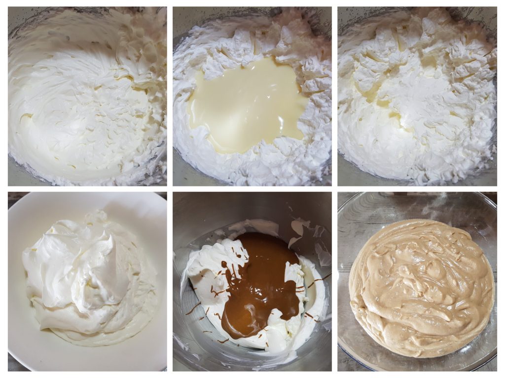 To make this delicious cream and hazelnut ice cream cake, all ingredients must be well chilled, including the bowl and electric whisks. First, prepare the simple hazelnut ice cream. In a bowl, whip the well-chilled heavy cream using electric whisks. When it is stiff, slowly add the cold sweetened condensed milk and continue whipping until you have a fluffy mixture. Finally, add the hazelnut paste and mix thoroughly. Place it in the freezer to firm up. Now, prepare the simple cream ice cream. In a bowl, whip the well-chilled heavy cream using electric whisks. When it is stiff, slowly add the cold sweetened condensed milk and continue whipping until you have a fluffy mixture.