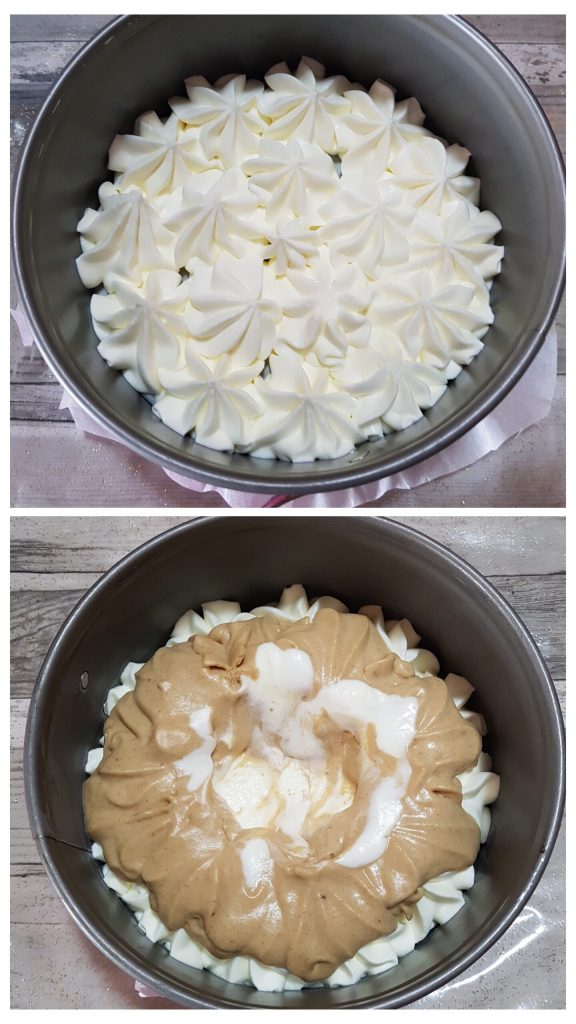 Line the base of a 20 cm springform pan with parchment paper. Place the cream ice cream in a pastry bag fitted with a large star tip and pipe it as shown in the photo to create the first layer. Place the pan in the freezer to firm up for 30-40 minutes. Meanwhile, also add the now firm hazelnut ice cream to the pastry bag fitted with a large star tip and pipe it onto the white base, leaving the edges free (see photo). Don’t worry if the cream tends to melt and doesn’t have the typical star shape like the cream ice cream; this happens because the hazelnut ice cream is much more liquid due to the presence of hazelnut paste. Immediately place it in the freezer to firm up for a couple of hours, and finally take out the pan and place chopped hazelnuts in the center of the cake. If you want a taller cake, simply make more layers on top of each other. If you have leftover hazelnut ice cream, simply place it in a disposable aluminum container and put it in the freezer.