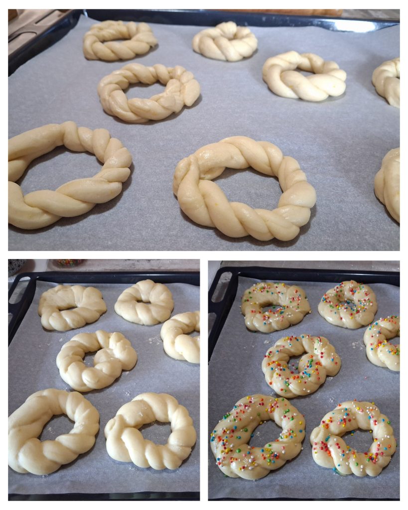 After the rising time, deflate the dough and cut it into pieces. To make braided rings, use two pieces of dough per ring. Roll them into long ropes, twist two ropes together to form a braid and join the ends to form a sealed ring.