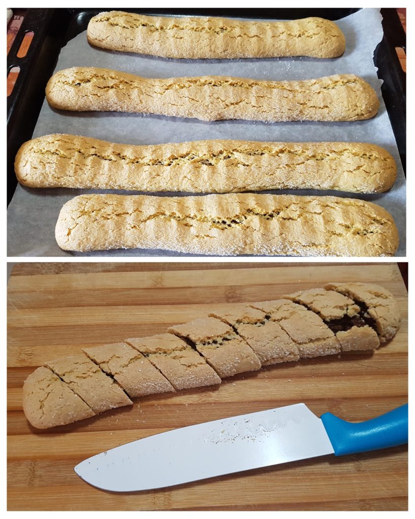 When they are cooked and still warm, cut the logs on a cutting board using a smooth-bladed knife diagonally and arrange all the cookies on the baking sheet lined with parchment paper. Return the baking sheet to the oven to toast for just 3 minutes, still at 350°F. If you like, you can skip this step; they will be a bit softer but just as tasty.