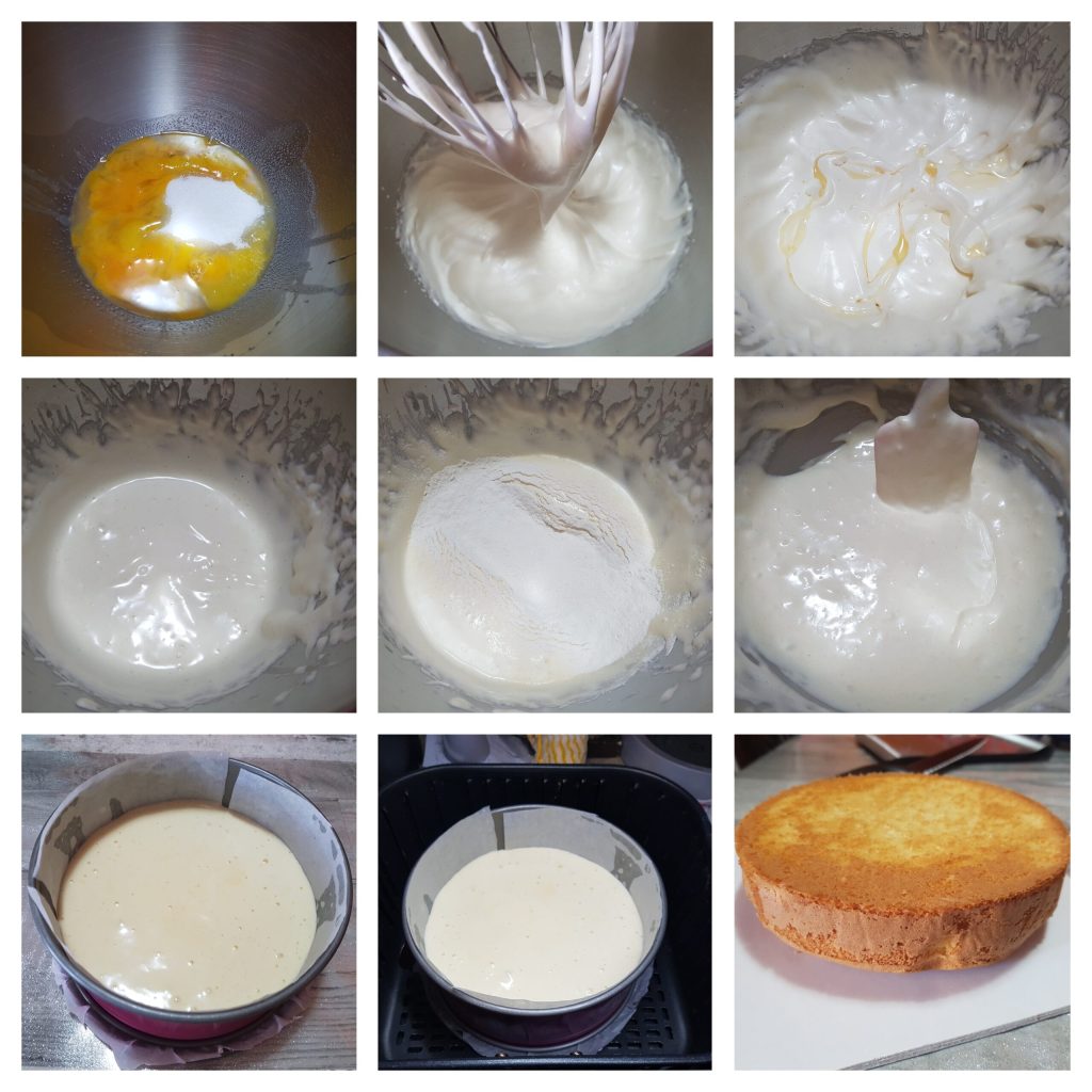 • In a large bowl, beat the eggs with the granulated sugar and vanilla extract or grated lemon zest for 10-15 minutes until they become foamy and whitish. Gradually add the melted butter or oil and the milk, and continue beating. Finally, add the sifted all-purpose flour, baking powder, and salt, and mix using a spatula from bottom to top without deflating the mixture, until you obtain a smooth and homogeneous batter. Preheat the air fryer to 400°F for 3 minutes. Pour the batter into a 8-inch springform pan previously greased and floured or use parchment paper (my air fryer has pans of these sizes for cooking in the basket), and bake in the air fryer for 30 minutes at 300°F. Then do the toothpick test, turn off and take out of the air fryer. Obviously, you can also bake in the oven at 350°F for 30-35 minutes.