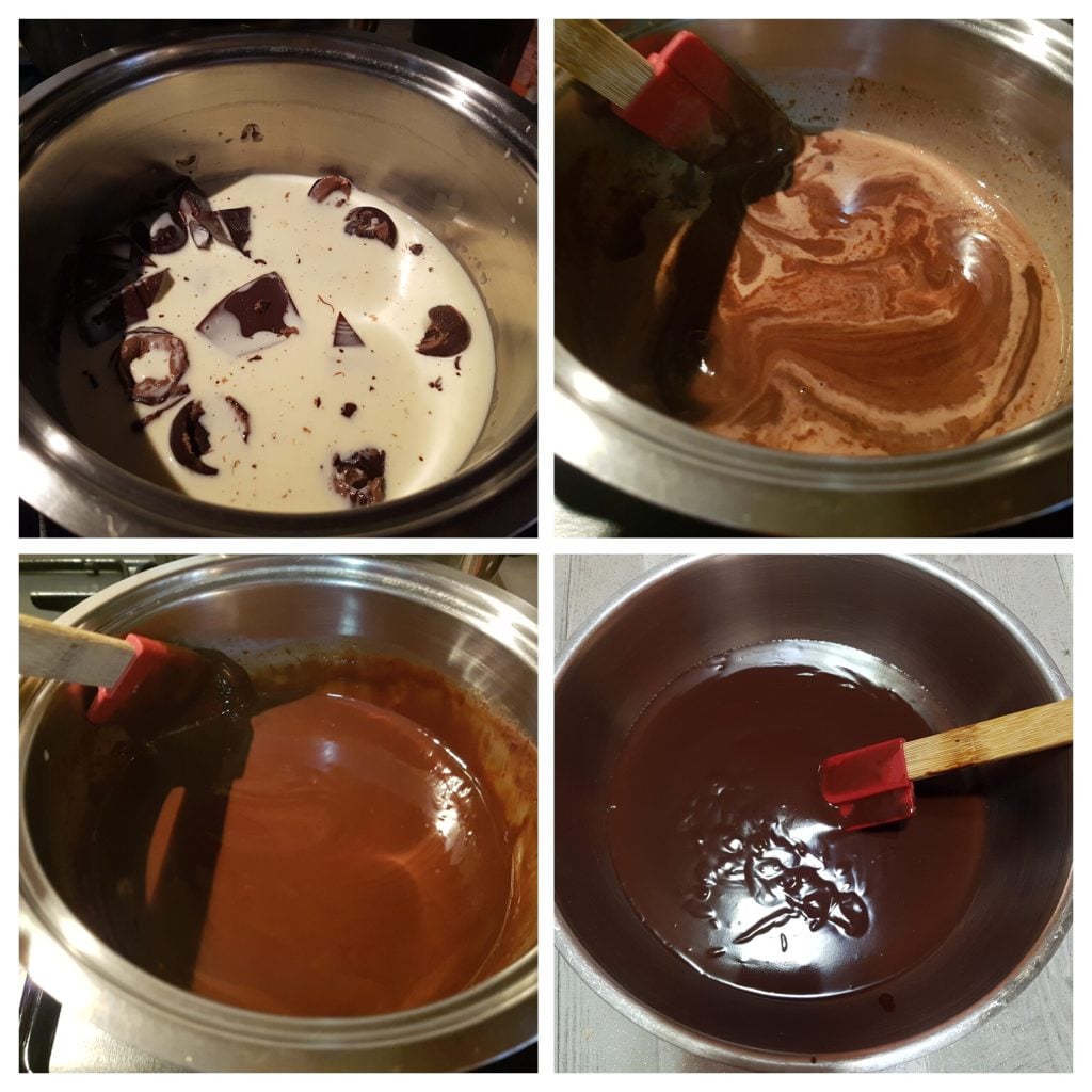 • In a saucepan, heat the cream, turn off the heat and add the chopped dark and milk chocolate, stirring until you obtain a glossy and creamy glaze. Finally, add the butter and stir. Allow to cool for about ten minutes or until the glaze reaches 95°F.
