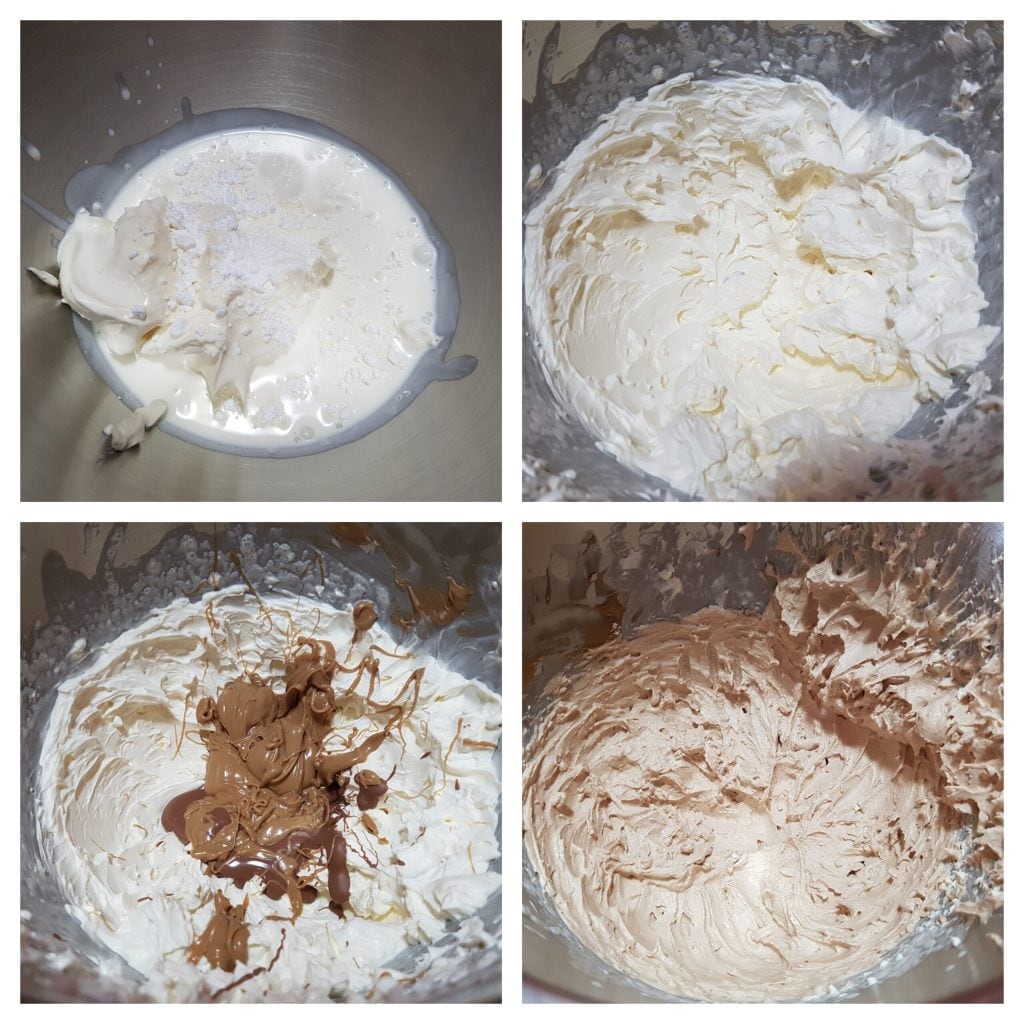 • In a large bowl, add the well-chilled mascarpone from the fridge, the well-chilled liquid cream, together with the powdered sugar, and beat for a few minutes until you get a fluffy and dense mixture. Add the previously melted and cooled milk chocolate and also pour in the white hazelnut spread, continuing to beat until you obtain a creamy mixture. Place in the fridge to set for 30 minutes.