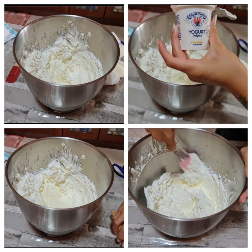 In a bowl, whip the already sweetened cream until it forms stiff peaks, add the two 4 oz. containers of lemon yogurt (125 g each) and the powdered sugar. Continue whipping until you get a fluffy mousse.