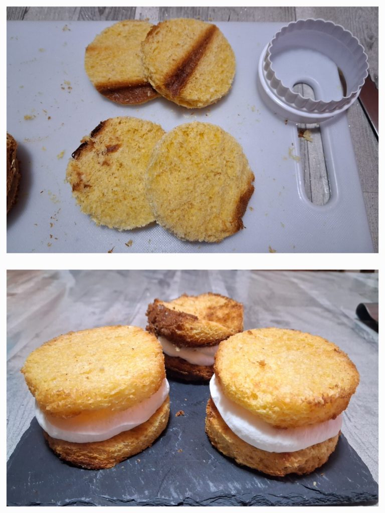 Take a pandoro and cut it into slices approximately 3/5 – 4/5 inch thick, then use a round cutter of 2 1/3 – 3 inches to get discs. I made 4 cakes. Toast the pandoro discs in a pan, or in an oven at 350°F for 5 minutes or in an air fryer at 390°F for 3 minutes. Let them cool. Take the whipped cream and fill the pandoro discs creating small cakes. Set aside some whipped cream for the final decoration. Place the cakes in the fridge to set for 1 hour.