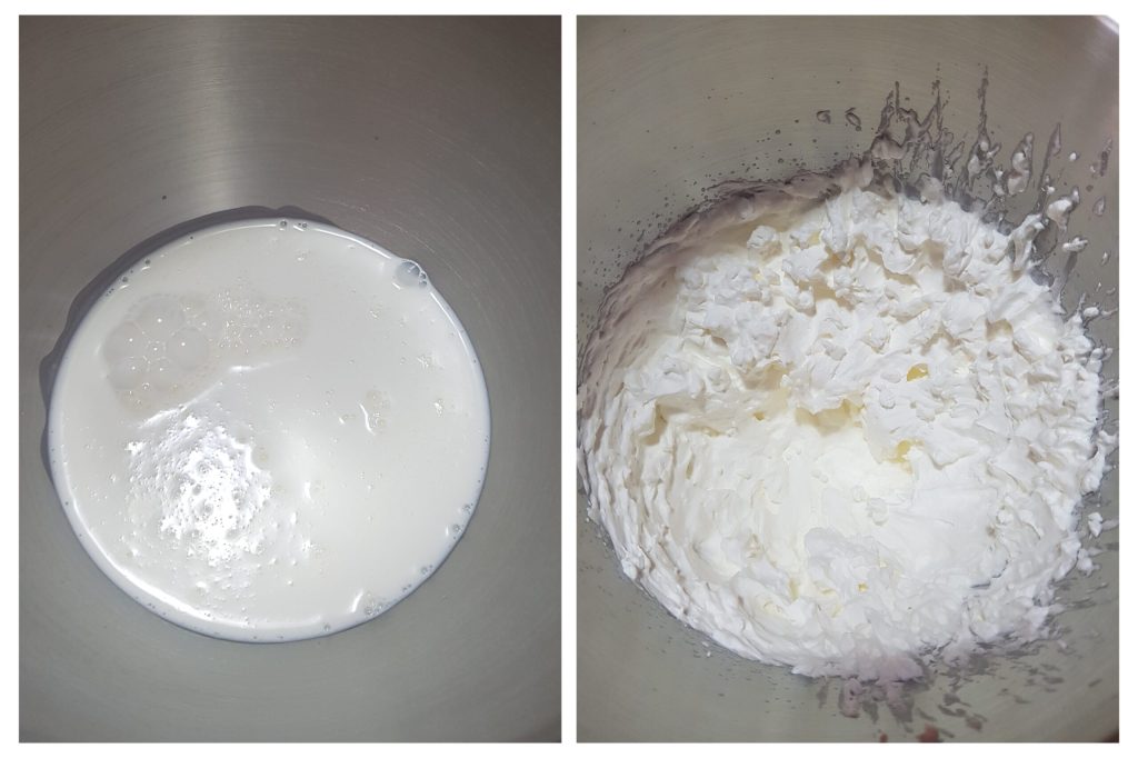 To make these delicious mini pandoro cakes, first whip the fresh cream with the powdered sugar. Take only 1 2/3 cups from the 2 cups, we will use the remaining liquid cream (1/3 cup) later for the chocolate glaze. When the fresh cream is whipped, put it in a pastry bag and place it in the fridge.