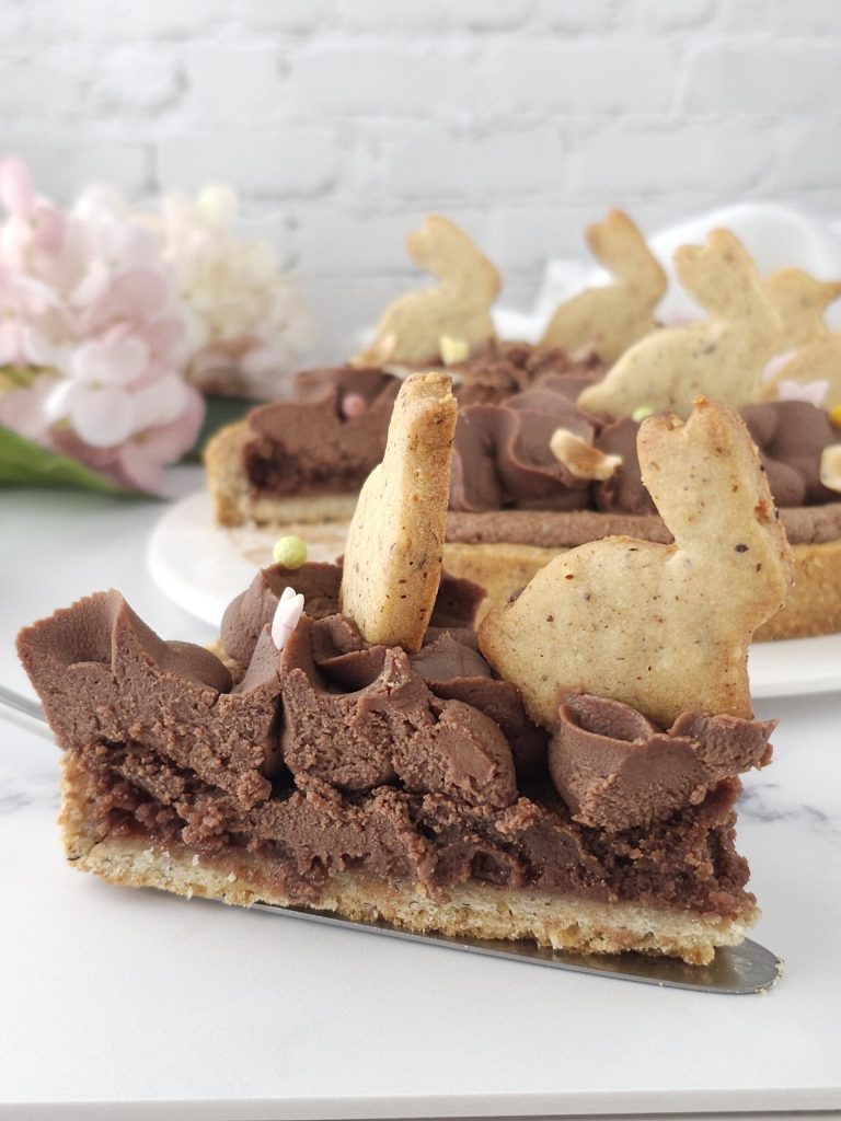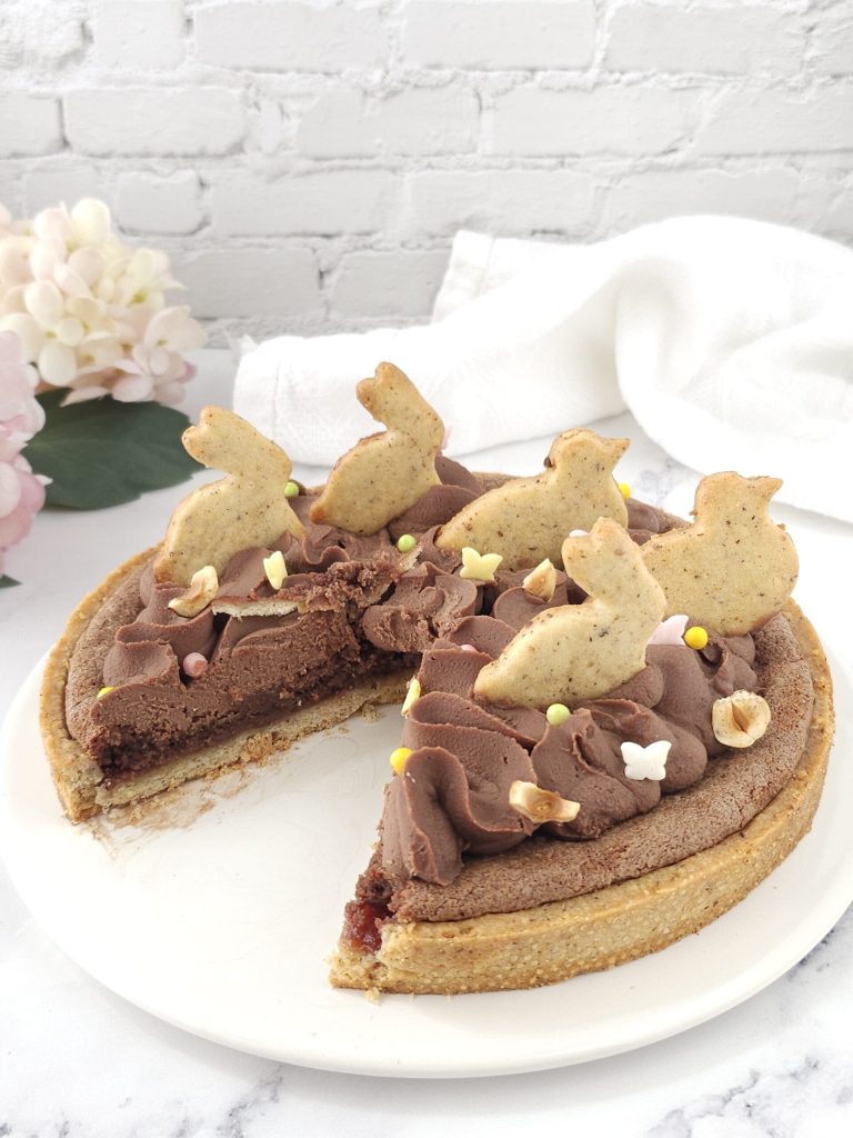 Hello friends, today I present to you this fabulous modern Easter tart made with a crunchy hazelnut shell, raspberry jam, dark chocolate frangipane, and whipped gianduia ganache. I assure you it is very simple to make, you just need to organize some preparations in advance and then assemble everything. Below you will find the recipe..