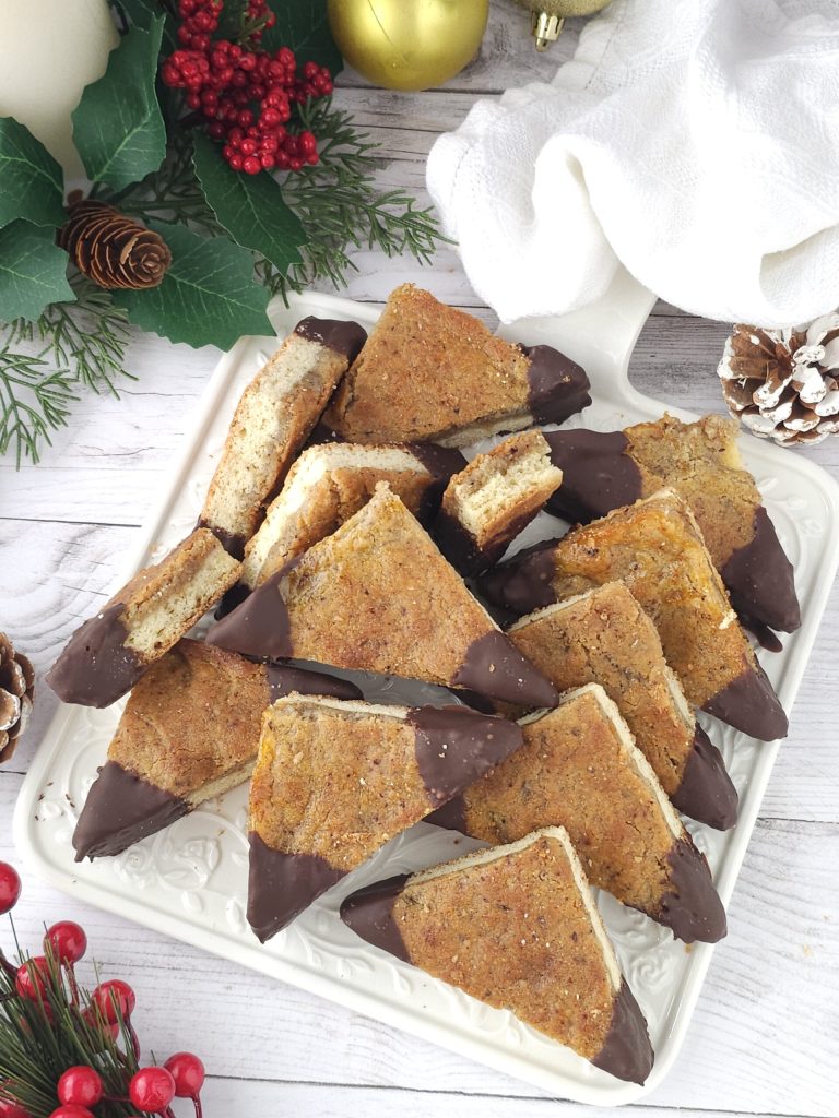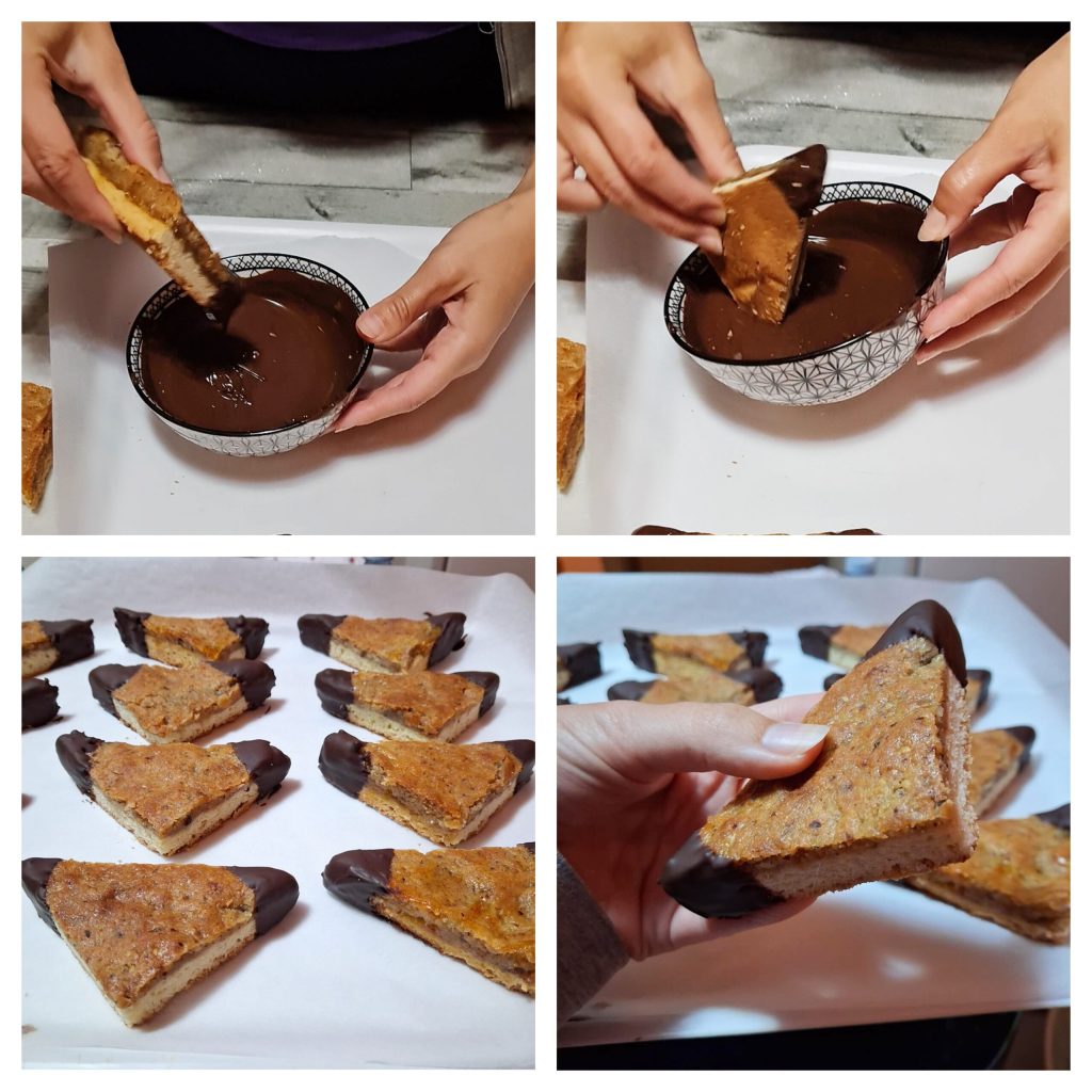 • Take each triangle and glaze the tips in previously melted dark chocolate over a bain-marie. You can also glaze them entirely if you wish. Let them dry.
