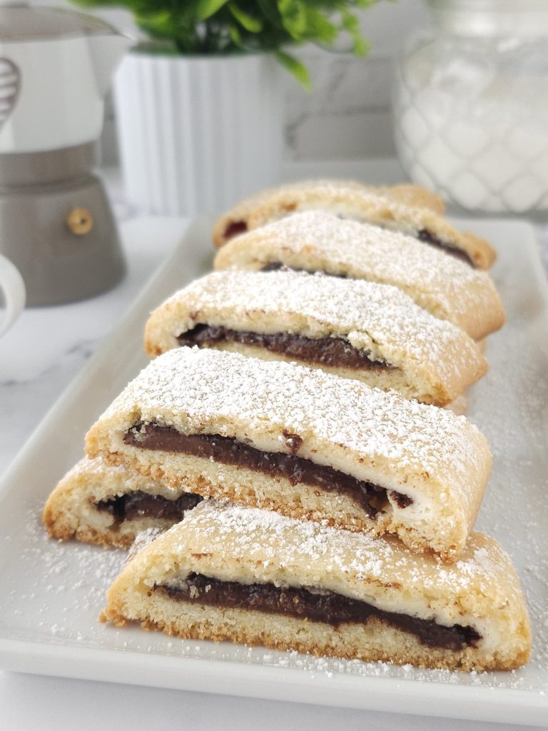 To make the Nutella and Ricotta shortcrust pastry roll, the first thing to do is prepare the shortcrust pastry. In the bowl of a stand mixer, add the sifted flour, pinch of salt, vanilla extract, baking powder, and cubed butter, and mix using the paddle attachment at speed 2 for a few minutes until you get a sandy dough. Add the egg and powdered sugar and mix for a few more minutes until you get a compact and homogeneous dough. Compress the shortcrust pastry well, wrap it in plastic wrap, and place it in the refrigerator for about an hour. You can also knead by hand or use any kitchen robot. Retrieve the shortcrust pastry from the fridge, divide it in two (with this dose you will make 2 rolls), work it a bit with your hands, and on a floured work surface using a rolling pin, roll out a 1/8 inch thick sheet to form a rectangle. Spread the ricotta and abundant Nutella down the center of the rectangle with the help of a spoon along the entire length. Close by wrapping one end first, then the other, sealing the edges well. Then wrap in parchment paper like candy and place the roll in the freezer for about 1 hour. This step will help maintain the shape of the roll during baking without flattening, and especially the Nutella will remain very soft and creamy. Do the same with the other shortcrust pastry. After an hour, place the 2 rolls on a baking sheet lined with parchment paper and bake in a preheated static oven at 360°F for about 20-25 minutes. Remove the shortcrust pastry rolls from the oven and let them cool.
