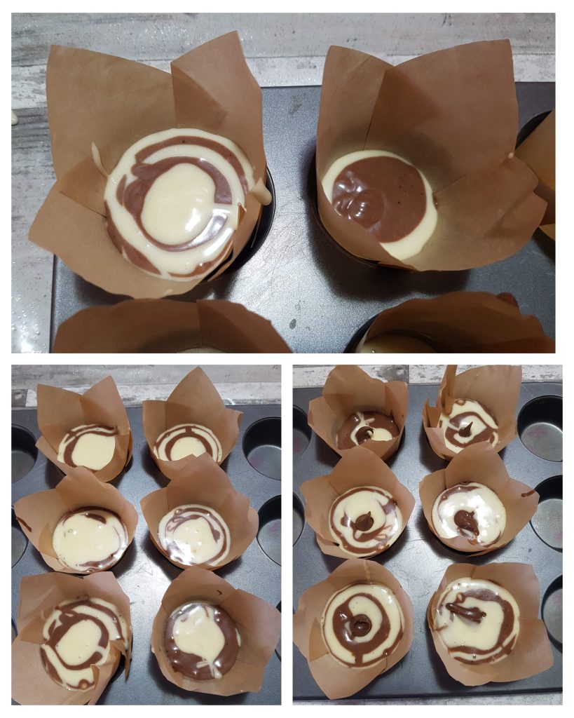 • Once the two batters are ready, place them in two piping bags or simply use 2 spoons. Line the muffin mold with liners and pour a spoonful of white batter, a spoonful of cocoa batter, repeating the same operation twice. You’ll obtain two-tone muffins as in the photo. Continue this way until the batter is used up. Finally, place a teaspoon of Nutella on the batter. Bake in a preheated static oven at 356°F (180°C) for 15-20 minutes. Turn off the oven, remove the muffins, and let them cool.