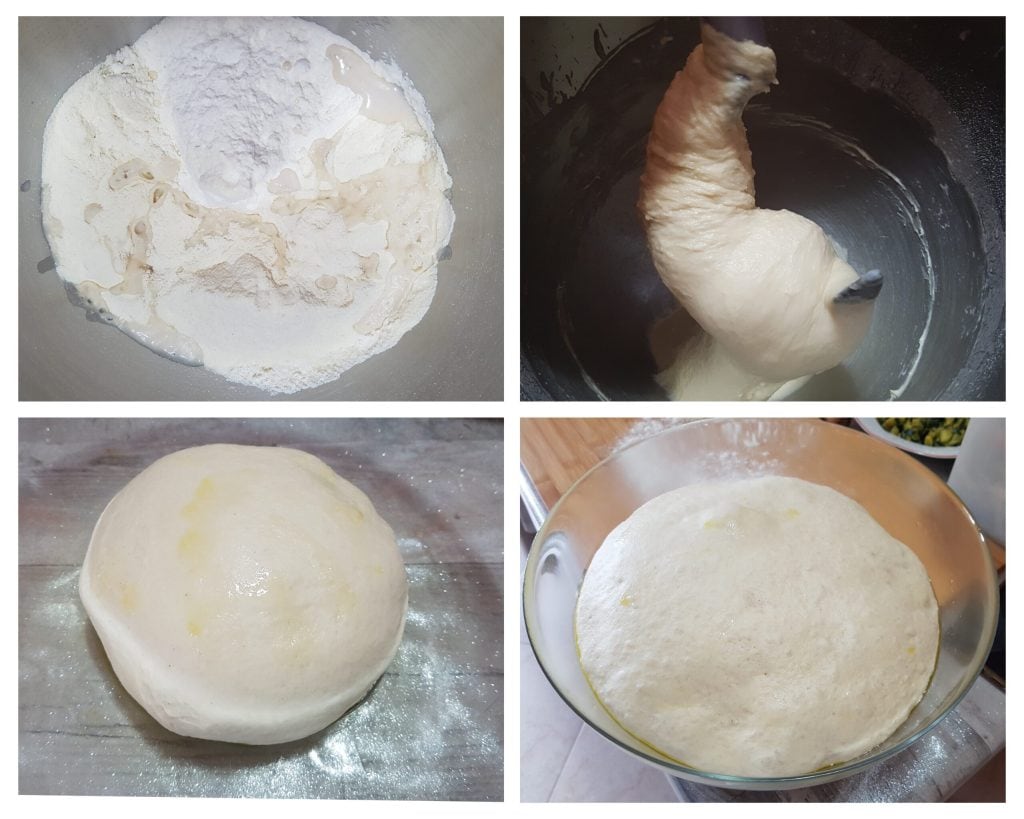 To make this delicious onion and olive focaccia, start by preparing the dough. In the bowl of the stand mixer, combine the sifted flours, yeast dissolved in a couple of tablespoons of water, sugar, and mix using the hook attachment. Gradually add the water in a stream and continue mixing. Finally, add the salt, then the olive oil, and continue mixing until the dough becomes smooth and elastic. This will take about 15-18 minutes. Be careful not to overheat the dough. This process can also be done by hand using a bowl. Once the dough is ready, give it a few folds for reinforcement and let it rise in an oiled bowl covered with plastic wrap until doubled in size. It will take about 3 hours.