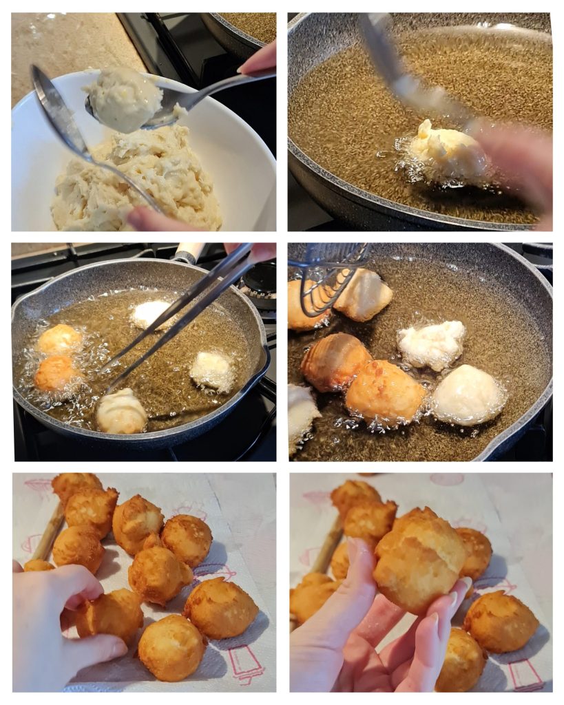 Pour peanut oil into a frying pan and heat it to a temperature of 320°F-340°F. Take the dough from the fridge and, using a spoon, form fritters to place in the oil. Cook on both sides for a few minutes, then drain on absorbent paper. If you like, you can use a piping bag to make perfect castagnole, but if you’re not experienced, it’s better to use a spoon.