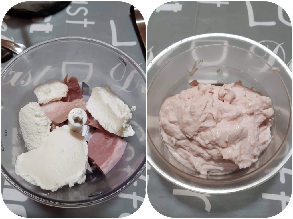 In a blender, place well-drained ricotta, salt, cooked ham, pepper, and finally a splash of liquid cream, and blend until you get a foamy cream. Place in the fridge for 30 minutes to firm up or prepare it the day before.