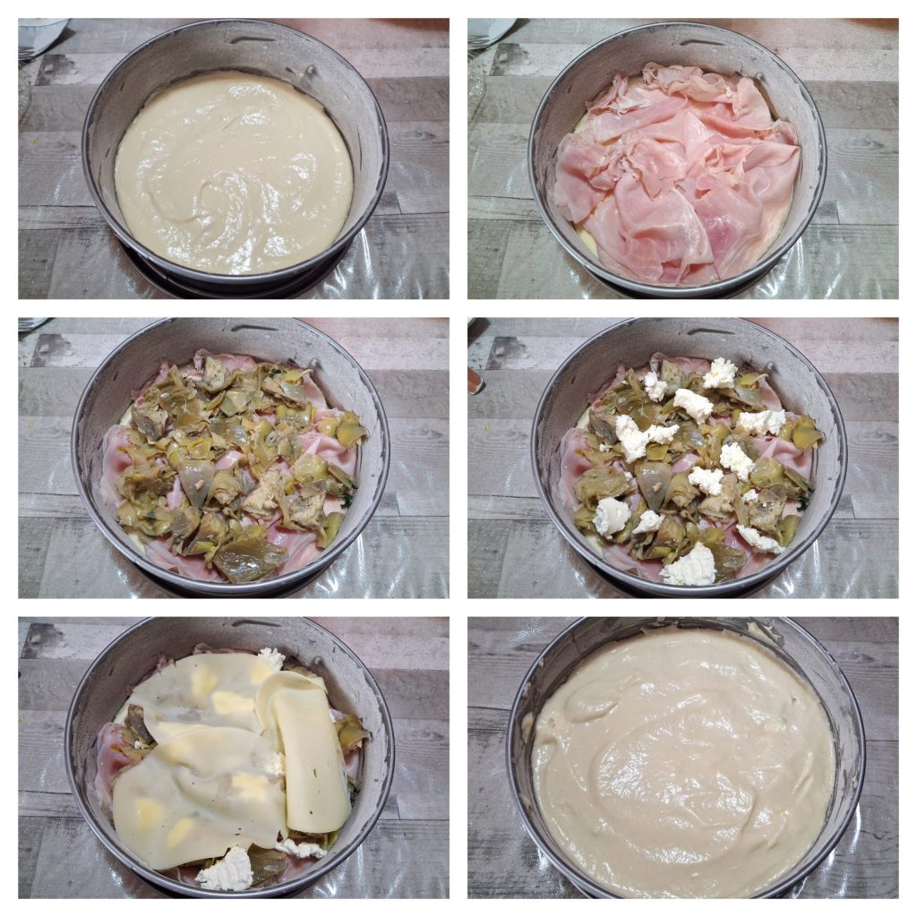 Butter and flour a 8 2/3 in (22 cm) springform pan, pour half of the batter and level well, arrange the slices of cooked ham, the sautéed artichokes (now cool), the robiola, the sliced provolone/mozzarella and cover with the remaining batter, smoothing carefully. Bake in a preheated convection oven at 356°F for about 35-40 minutes. Oven times vary, so check after 30 minutes. Do the toothpick test, remove from the oven and let cool for about ten minutes.