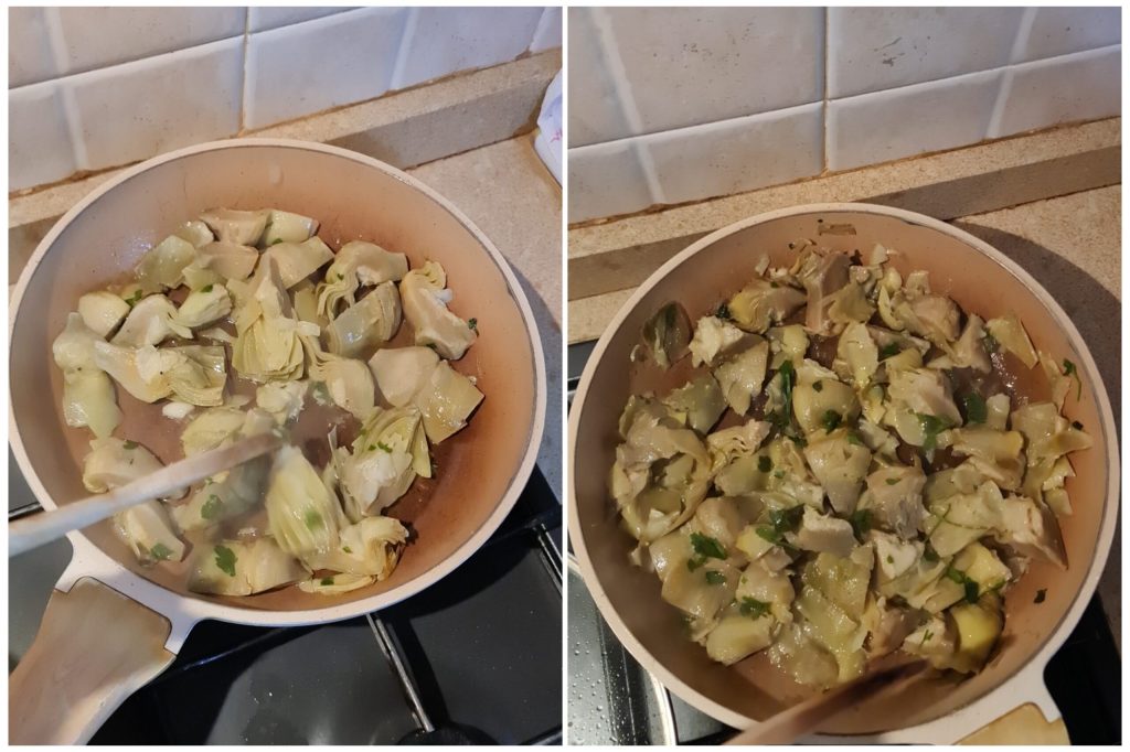 In a pan pour the extra virgin olive oil and the garlic clove, add the artichoke hearts (if frozen), salt and pepper and cook for about twenty minutes, adding a little water gradually. When cooked, turn off the heat and let them cool.